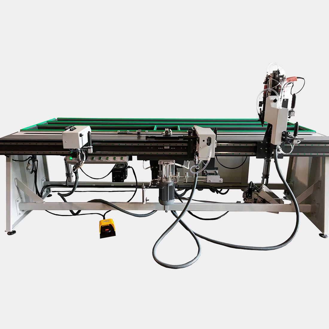 • Máquina que posee una capacidad para albergar marcos de hoja o ventana con alto máximo de 3000×3000 mm aprox. y un mínimo de 300×300 con espesor máximo 100 mm y una sección variable entre 25 a 100mm.